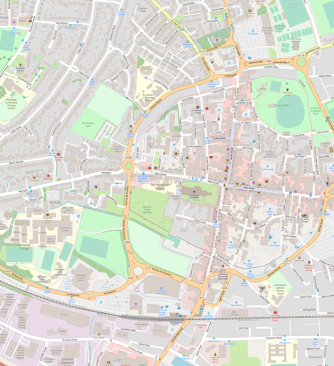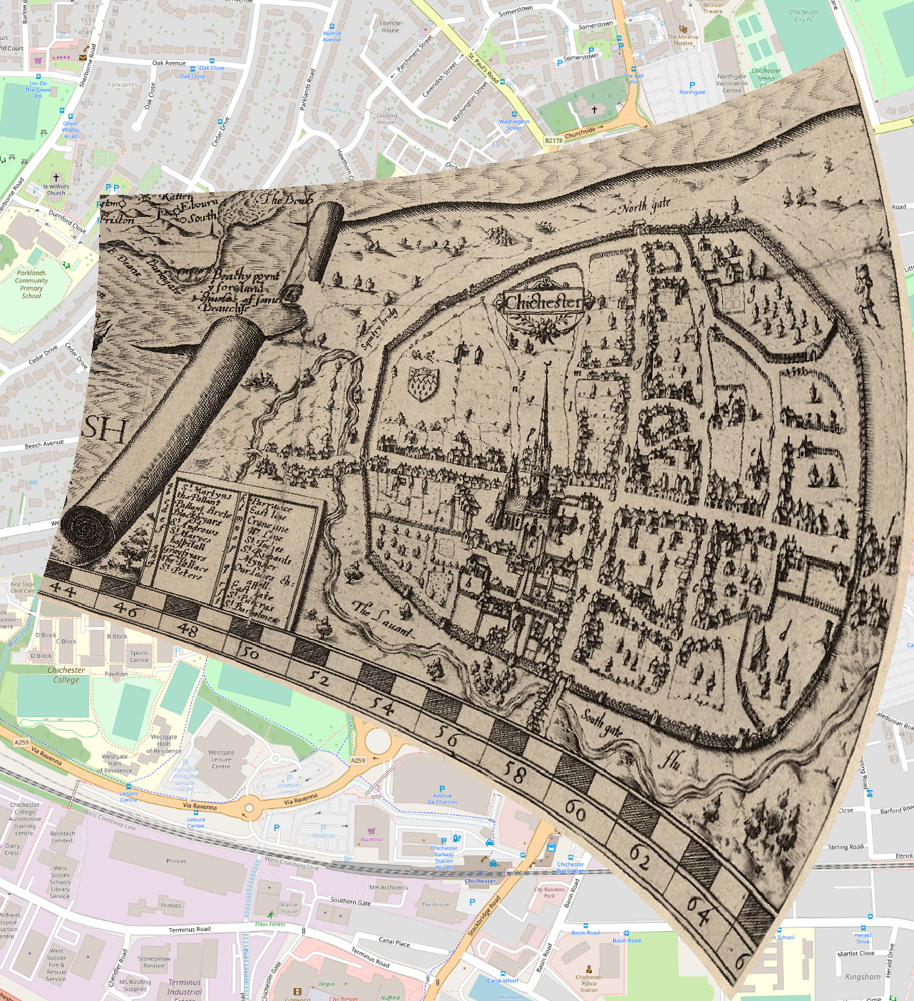 John Nordon Map of Chichester 1595 compared with modern Chichester